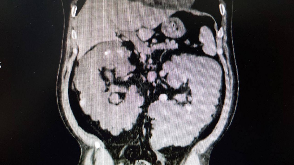 و باجراء الفحوصات تبين وجود أكياس متعدده ممتلئة بالصديد و التجمعات الدموية، و تم استئصال الكليه اليسري بنجاح علما بأن المريض كان يقوم باجراء الغسيل الكلوي المستمر.