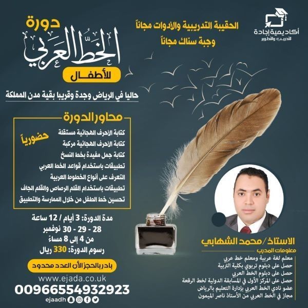 دورة الخط العربي للاطفال بتنظيم أكاديمية إجادة للتدريب والتطوير وقيادة مدرب الخط العربي الأستاذ محمد الشهابي الرياض