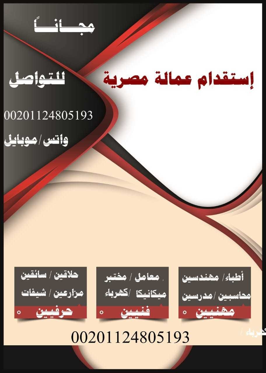 نحن مكتب إستقدام مصري نوفر لدول الخليج العمالة المصرية المطلوبة من كل التخصصات والمجالات( الفنية / العلمية / الحرفية ) من اطباء و مهندسين معماريين ومدنى وهيدروليك حرفيون وفنيون وسواقين وميكانيكيين وبنائين وشيفات وعمال خدمة فنادق خمس نجوم وعمال جبسن بورد ودهانيين وسائقين خاص ونقل ثقيل ومندوبين مبيعات ونجارين مسلح وحدادين وممرضين وفنيي اشعة وبخبرات وكفاءة عالية .